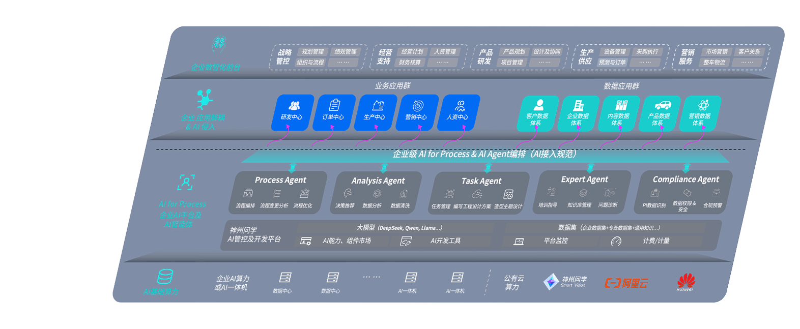 端到端的一站式AI工作空间深度融合了从企业战略规划到日常经营的全流程业务板块,,,,定向解决车企内部领域多、、、、部门多、、链条长、、场景碎片化等难题,,支持车企快速构建以AI为核心的生产力写作体系,,实现任务执行与AI能力的无缝集成与交互