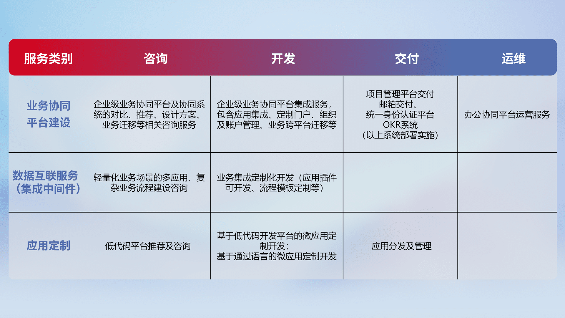 针对钉钉、、、、企微、、、IDaas等平台级产品提供产品的规划、、、方案、、、交付、、定制化开发等服务,,实现如统一协同办公、、、智能客户服务、、混合会议管理、、、智能数据查询、、、等业务场景,,,实现数字化转型。。。。