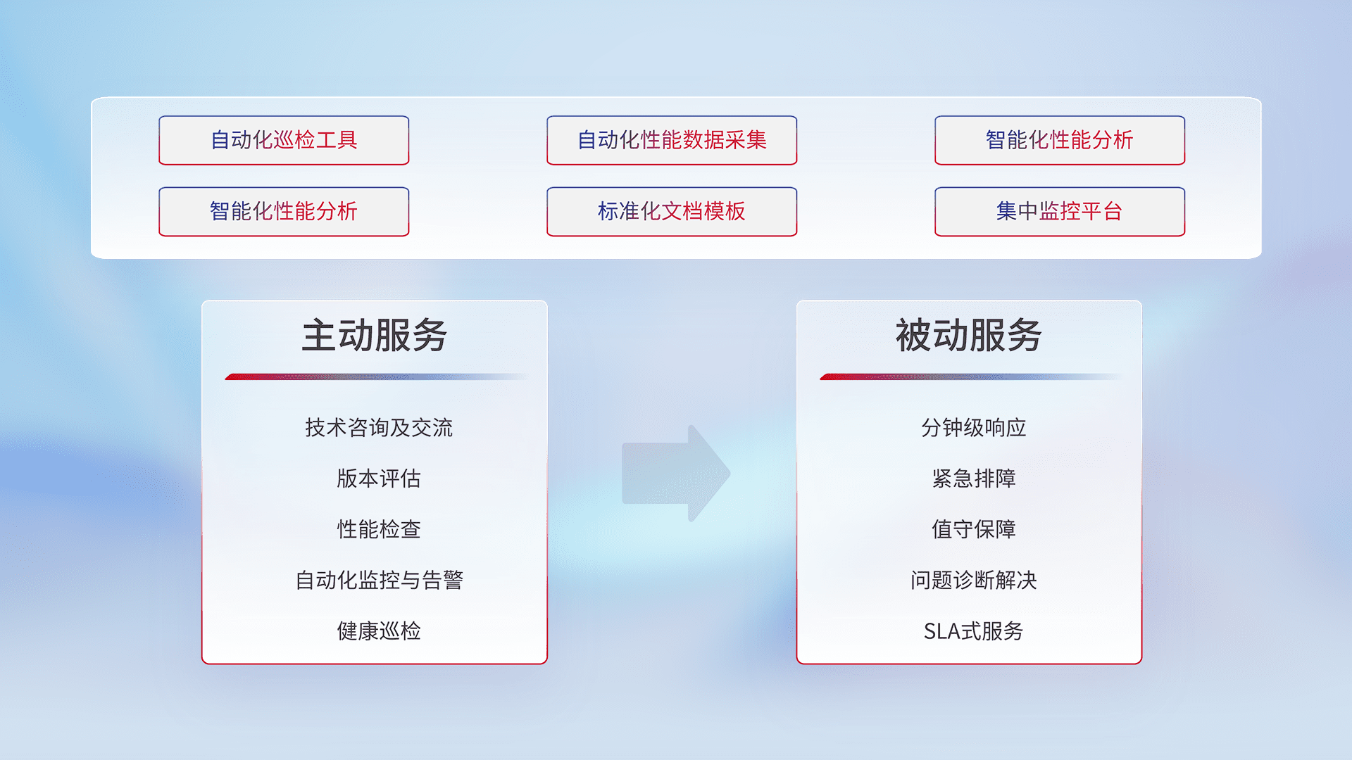 智能化工具和标准化文档,,保障服务质量,,提供主动服务(包含技术咨询、、版本评估、、性能检查、、、、自动化监控与告警、、健康巡检)和被动服务包含(分钟级响应、、、紧急排障、、、值守保障、、、、问题诊断解决、、、、SLA服务)。。。。